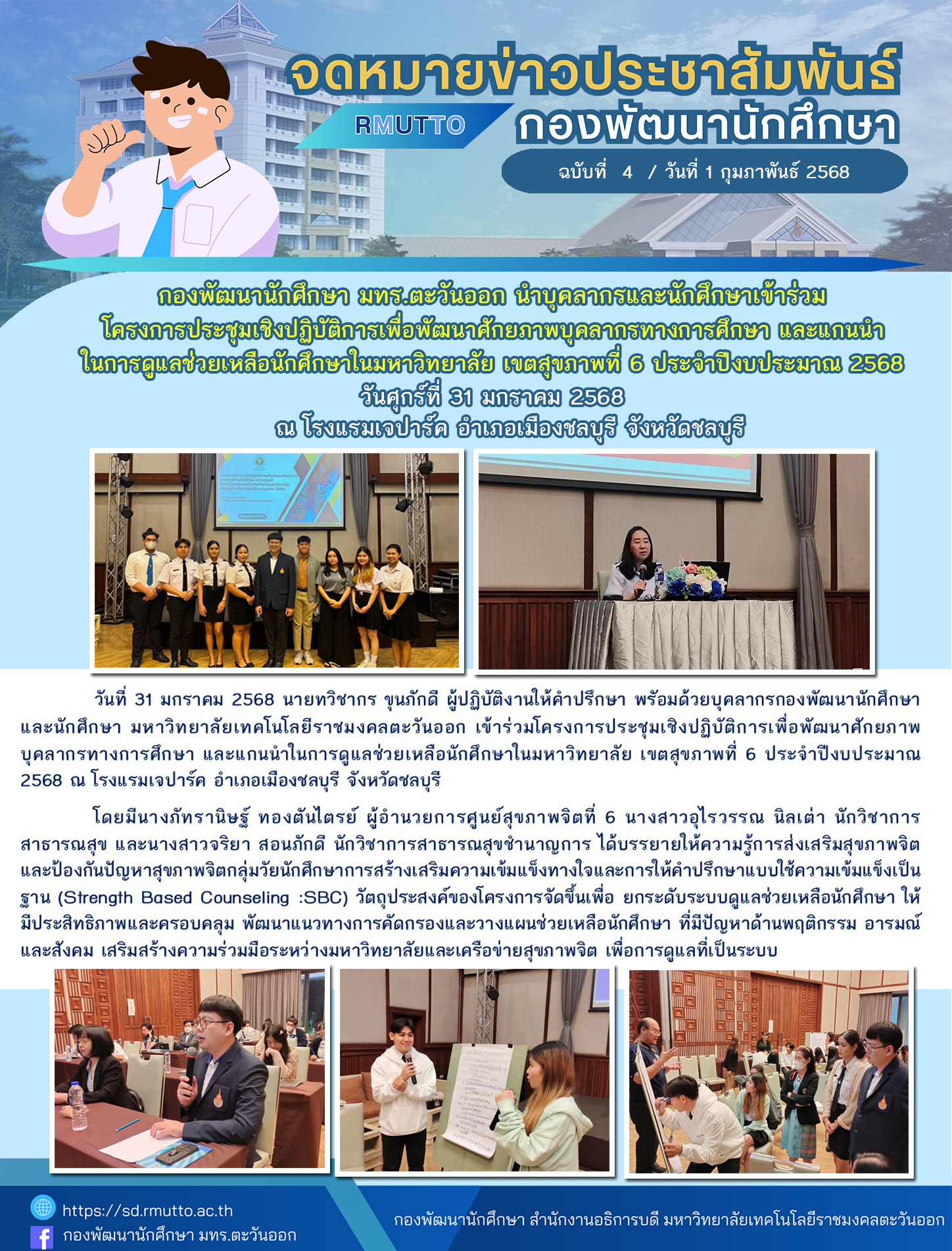 วันที่ 31 มกราคม 2568 นายทวิชากร ขุนภักดี ผู้ปฏิบัติงานให้คำปรึกษา พรัอมด้วยบุคลากรกองพัฒนานักศึกษาและนักศึกษา มหาวิทยาลัยเทคโนโลยีราชมงคลตะวันออก เข้าร่วมโครงการประชุมเชิงปฏิบัติการเพื่อพัฒนาศักยภาพบุคลากรทางการศึกษา และแกนนําในการดูแลช่วยเหลือนักศึกษาในมหาวิทยาลัย เขตสุขภาพที่ 6 ประจําปีงบประมาณ 2568 ณ โรงแรมเจปาร์ค อําเภอเมืองชลบุรี จังหวัดชลบุรี