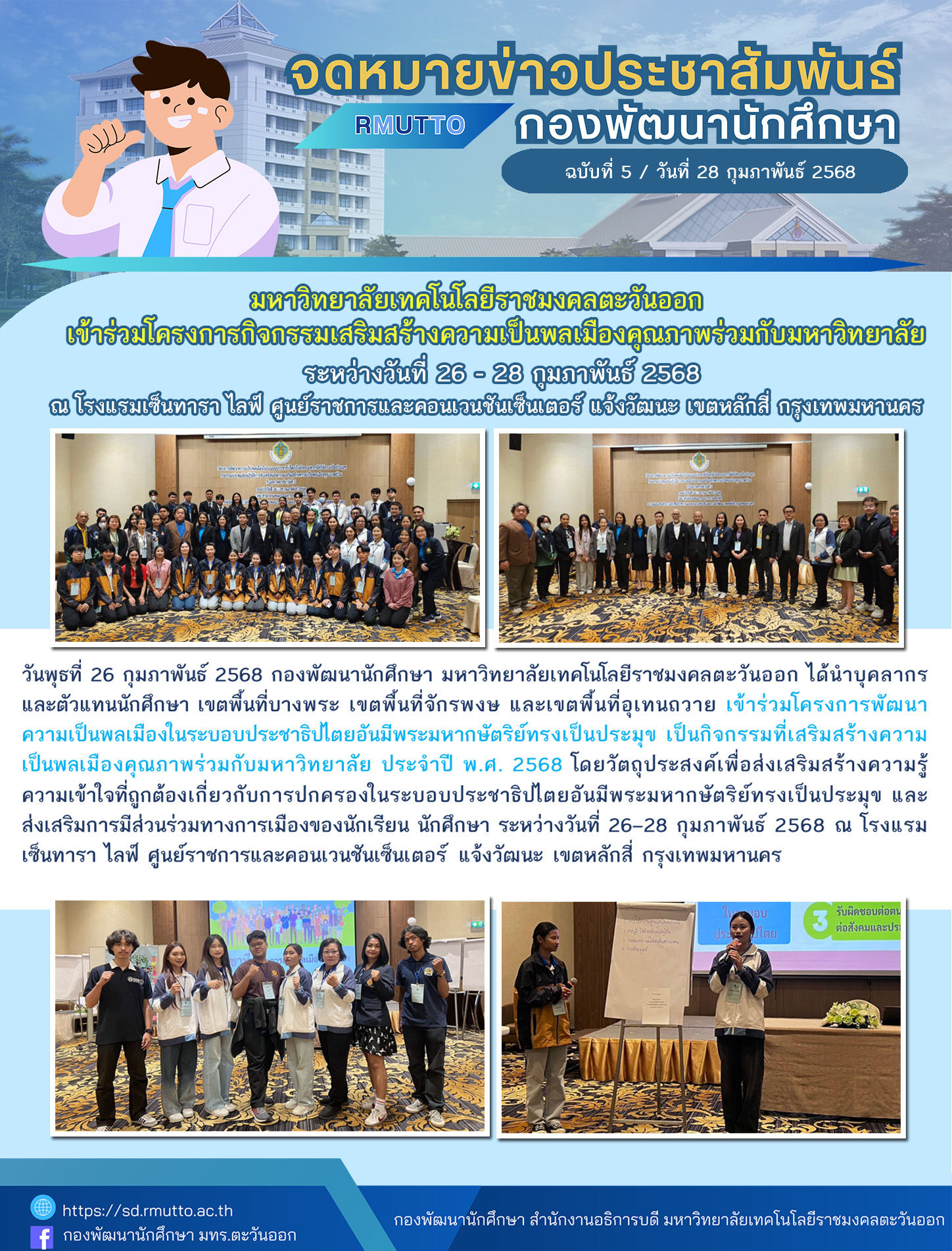 วันพุธที่ 26 กุมภาพันธ์ 2568 กองพัฒนานักศึกษา มหาวิทยาลัยเทคโนโลยีราชมงคลตะวันออก ได้นำบุคลากรและตัวแทนนักศึกษา เขตพื้นที่บางพระ เขตพื้นที่จักรพงษ และเขตพื้นที่อุเทนถวาย เข้าร่วมโครงการพัฒนาความเป็นพลเมืองในระบอบประชาธิปไตยอันมีพระมหากษัตริย์ทรงเป็นประมุข เป็นกิจกรรมที่เสริมสร้างความเป็นพลเมืองคุณภาพร่วมกับมหาวิทยาลัย ประจำปี พ.ศ. 2568 โดยวัตถุประสงค์เพื่อส่งเสริมสร้างความรู้ความเข้าใจที่ถูกต้องเกี่ยวกับการปกครองในระบอบประชาธิปไตยอันมีพระมหากษัตริย์ทรงเป็นประมุข และส่งเสริมการมีส่วนร่วมทางการเมืองของนักเรียน นักศึกษา ระหว่างวันที่ 26–28 กุมภาพันธ์ 2568 ณ โรงแรมเซ็นทารา ไลฟ์ ศูนย์ราชการและคอนเวนชันเซ็นเตอร์ แจ้งวัฒนะ เขตหลักสี่ กรุงเทพมหานคร