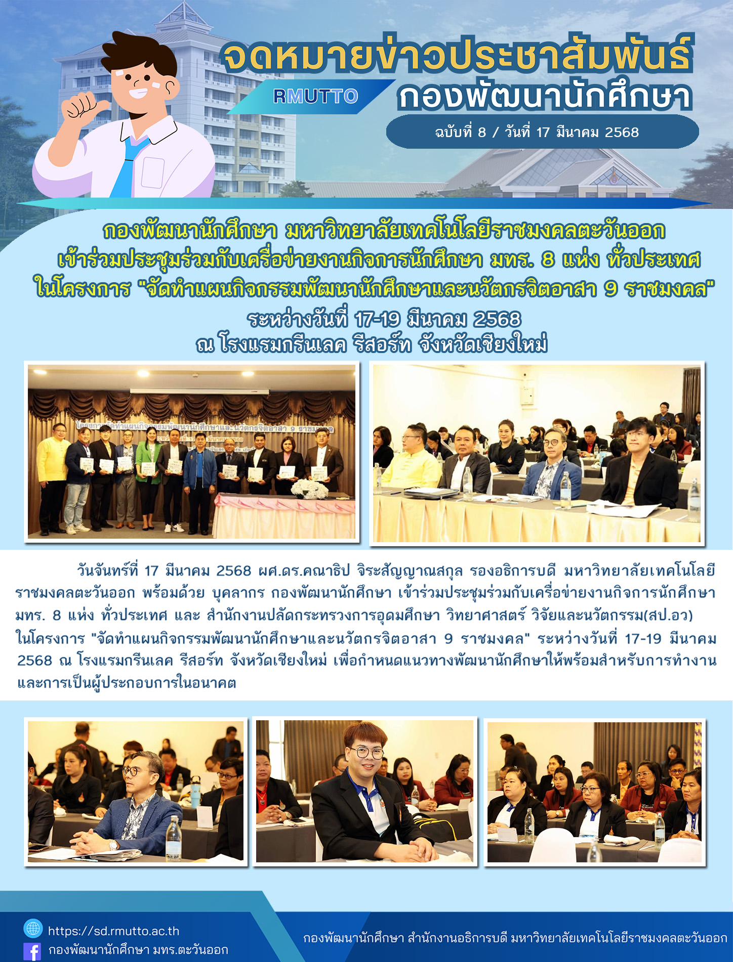 วันจันทร์ที่ 17 มีนาคม 2568 ผศ.ดร.คณาธิป จิระสัญญาณสกุล รองอธิการบดี มหาวิทยาลัยเทคโนโลยีราชมงคลตะวันออก พร้อมด้วย บุคลากร กองพัฒนานักศึกษา เข้าร่วมประชุมร่วมกับเครื่อข่ายงานกิจการนักศึกษา มทร. 8 แห่ง ทั่วประเทศ และ สำนักงานปลัดกระทรวงการอุดมศึกษา วิทยาศาสตร์ วิจัยและนวัตกรรม(สป.อว) ในโครงการ "จัดทำแผนกิจกรรมพัฒนานักศึกษาและนวัตกรจิตอาสา 9 ราชมงคล" ระหว่างวันที่ 17-19 มีนาคม 2568 ณ โรงแรมกรีนเลค รีสอร์ท จังหวัดเชียงใหม่ เพื่อกำหนดแนวทางพัฒนานักศึกษาให้พร้อมสำหรับการทำงานและการเป็นผู้ประกอบการในอนาคต