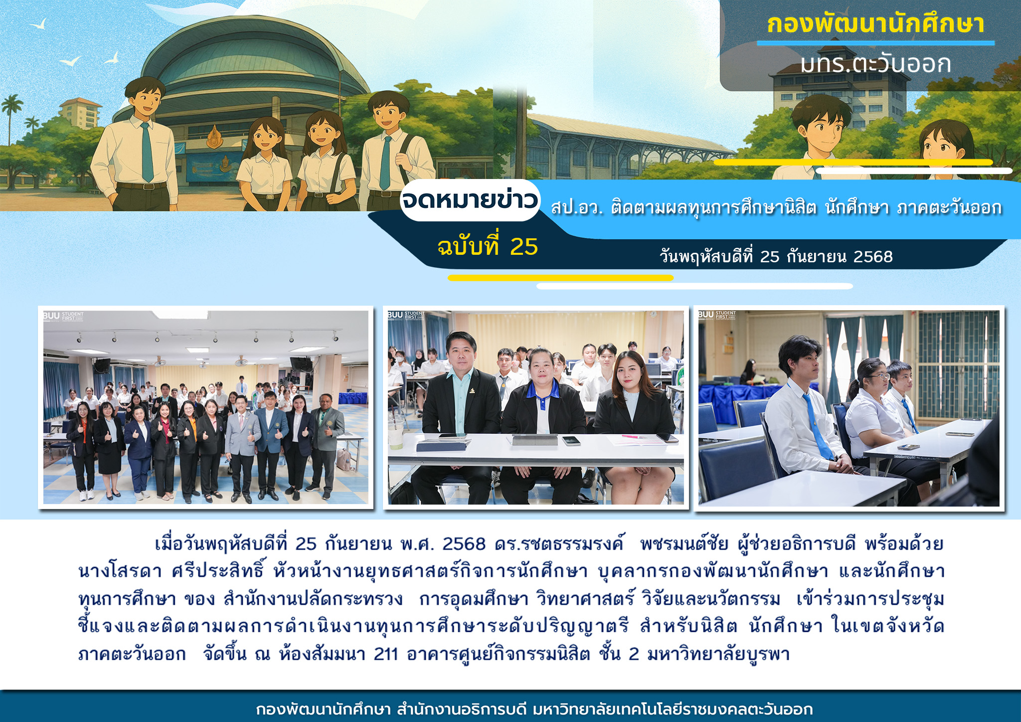 เมื่อวันพฤหัสบดีที่ 25 กันยายน พ.ศ. 2568 ดร.รชตธรรมรงค์ พชรมนต์ชัย ผู้ช่วยอธิการบดี พร้อมด้วย นางโสรดา ศรีประสิทธิ์ หัวหน้างานยุทธศาสตร์กิจการนักศึกษา บุคลากรกองพัฒนานักศึกษา และนักศึกษาทุนการศึกษา ของ สำนักงานปลัดกระทรวง การอุดมศึกษา วิทยาศาสตร์ วิจัยและนวัตกรรม เข้าร่วมการประชุมชี้แจงและติดตามผลการดำเนินงานทุนการศึกษาระดับปริญญาตรี สำหรับนิสิต นักศึกษา ในเขตจังหวัด ภาคตะวันออก จัดขึ้น ณ ห้องสัมมนา 211 อาคารศูนย์กิจกรรมนิสิต ชั้น 2 มหาวิทยาลัยบูรพา