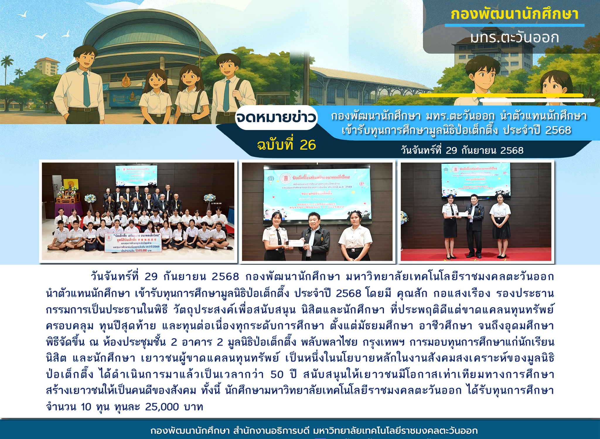 วันจันทร์ที่ 29 กันยายน 2568 กองพัฒนานักศึกษา มหาวิทยาลัยเทคโนโลยีราชมงคลตะวันออก นำตัวแทนนักศึกษา เข้ารับทุนการศึกษามูลนิธิป่อเต็กตึ๊ง ประจำปี 2568 โดยมี คุณสัก กอแสงเรือง รองประธานกรรมการเป็นประธานในพิธี วัตถุประสงค์เพื่อสนับสนุน นิสิตและนักศึกษา ที่ประพฤติดีแต่ขาดแคลนทุนทรัพย์ ครอบคลุม ทุนปีสุดท้าย และทุนต่อเนื่องทุกระดับการศึกษา ตั้งแต่มัธยมศึกษา อาชีวศึกษา จนถึงอุดมศึกษา พิธีจัดขึ้น ณ ห้องประชุมชั้น 2 อาคาร 2 มูลนิธิป่อเต็กตึ๊ง พลับพลาไชย กรุงเทพฯ การมอบทุนการศึกษาแก่นักเรียน นิสิต และนักศึกษา เยาวชนผู้ขาดแคลนทุนทรัพย์ เป็นหนึ่งในนโยบายหลักในงานสังคมสงเคราะห์ของมูลนิธิป่อเต็กตึ๊ง ได้ดำเนินการมาแล้วเป็นเวลากว่า 50 ปี สนับสนุนให้เยาวชนมีโอกาสเท่าเทียมทางการศึกษา สร้างเยาวชนให้เป็นคนดีของสังคม ทั้งนี้ นักศึกษามหาวิทยาลัยเทคโนโลยีราชมงคลตะวันออก ได้รับทุนการศึกษาจำนวน 10 ทุน ทุนละ 25,000 บาท