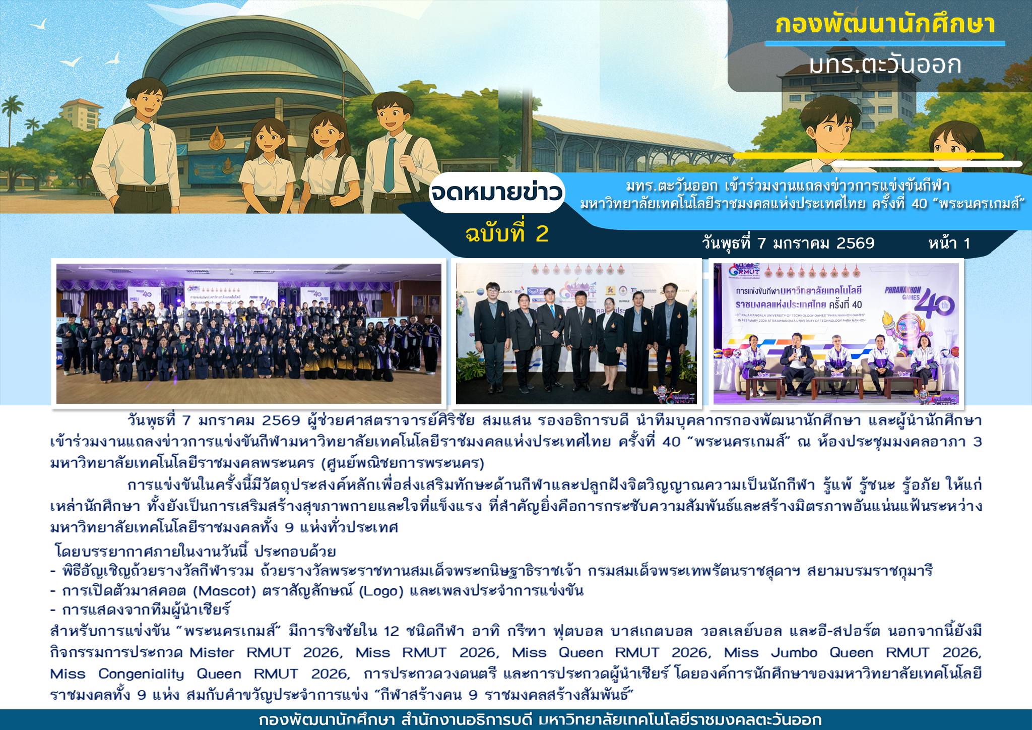 วันพุธที่ 7 มกราคม 2569 ผู้ช่วยศาสตราจารย์ศิริชัย สมแสน รองอธิการบดี นำทีมบุคลากรกองพัฒนานักศึกษา และผู้นำนักศึกษา เข้าร่วมงานแถลงข่าวการแข่งขันกีฬามหาวิทยาลัยเทคโนโลยีราชมงคลแห่งประเทศไทย ครั้งที่ 40 “พระนครเกมส์” ณ ห้องประชุมมงคลอาภา 3 มหาวิทยาลัยเทคโนโลยีราชมงคลพระนคร (ศูนย์พณิชยการพระนคร)