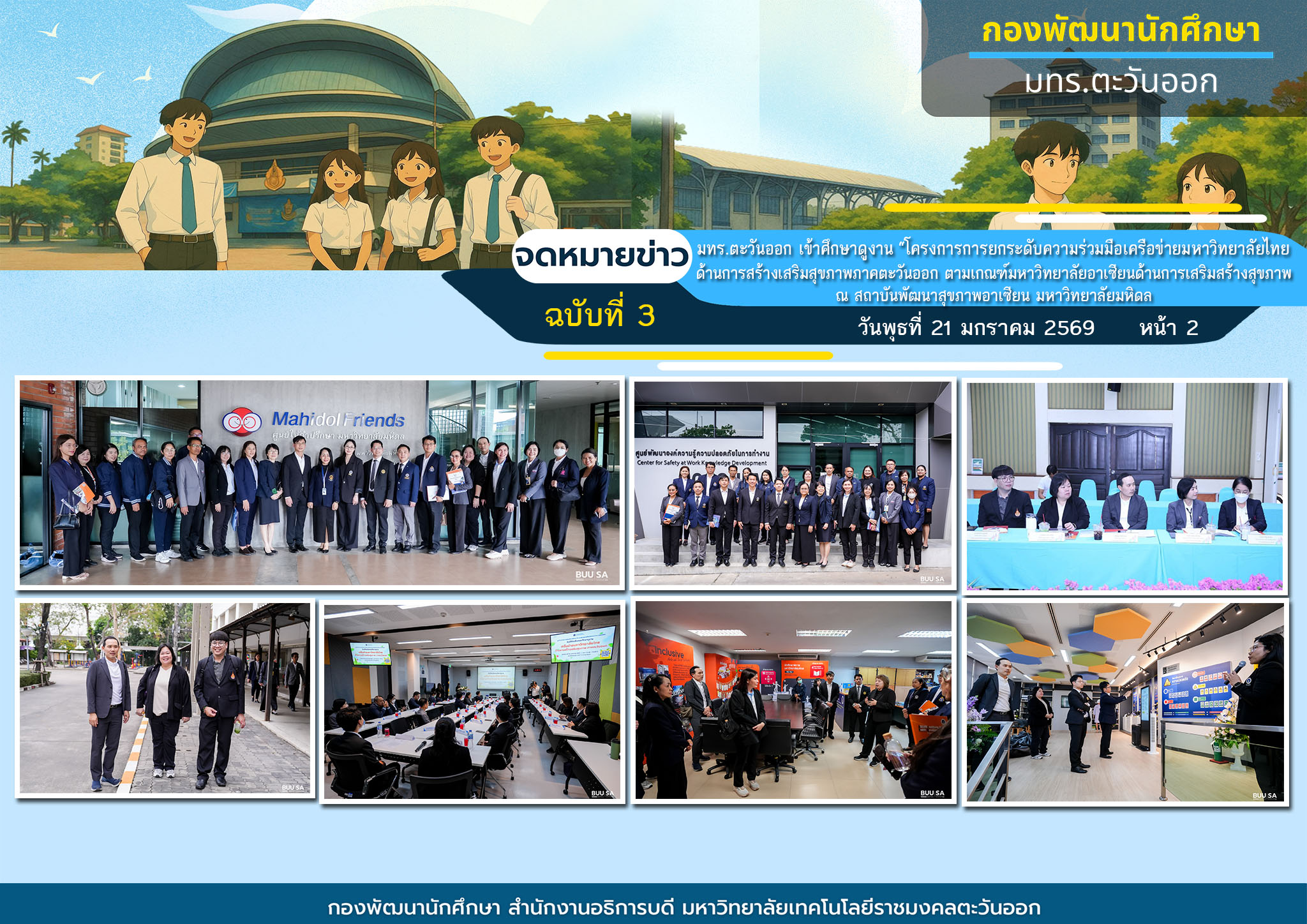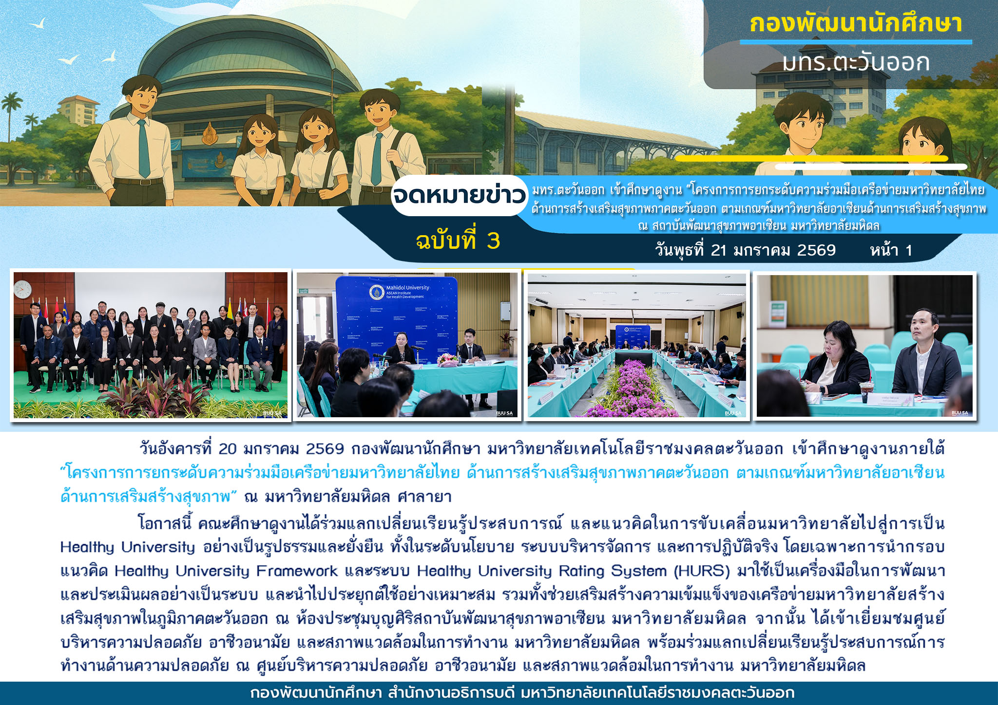 วันอังคารที่ 20 มกราคม 2569 กองพัฒนานักศึกษา มหาวิทยาลัยเทคโนโลยีราชมงคลตะวันออก เข้าศึกษาดูงานภายใต้ “โครงการการยกระดับความร่วมมือเครือข่ายมหาวิทยาลัยไทย ด้านการสร้างเสริมสุขภาพภาคตะวันออก ตามเกณฑ์มหาวิทยาลัยอาเซียนด้านการเสริมสร้างสุขภาพ” ณ มหาวิทยาลัยมหิดล ศาลายา