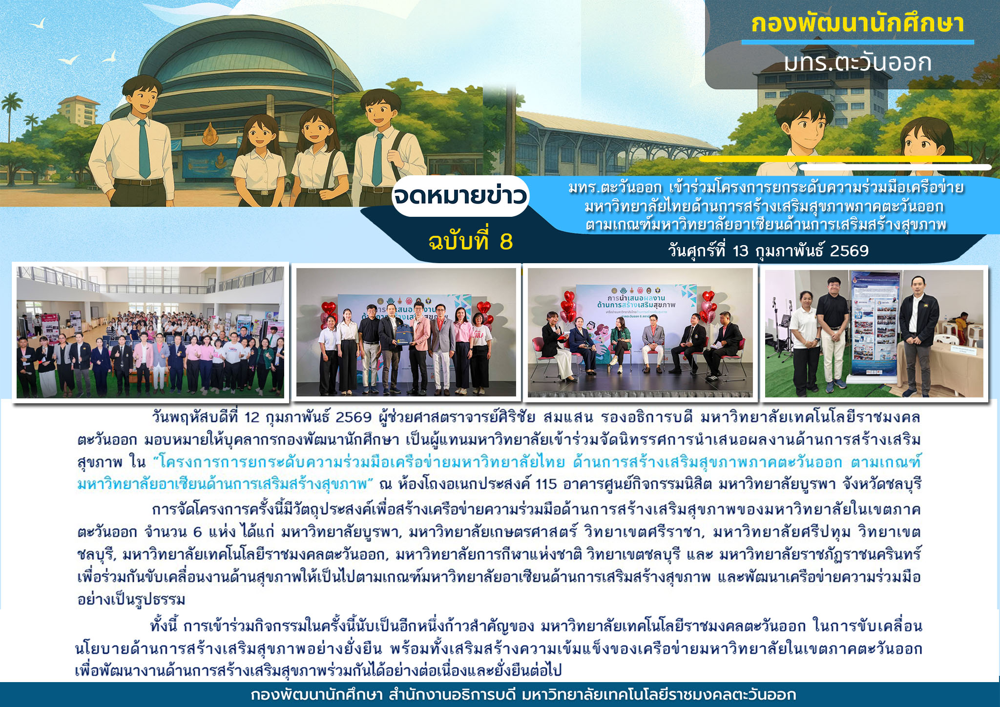 วันพฤหัสบดีที่ 12 กุมภาพันธ์ 2569 ผู้ช่วยศาสตราจารย์ศิริชัย สมแสน รองอธิการบดี มหาวิทยาลัยเทคโนโลยีราชมงคลตะวันออก มอบหมายให้บุคลากรกองพัฒนานักศึกษา เป็นผู้แทนมหาวิทยาลัยเข้าร่วมจัดนิทรรศการนำเสนอผลงานด้านการสร้างเสริมสุขภาพ ใน “โครงการการยกระดับความร่วมมือเครือข่ายมหาวิทยาลัยไทย ด้านการสร้างเสริมสุขภาพภาคตะวันออก ตามเกณฑ์มหาวิทยาลัยอาเซียนด้านการเสริมสร้างสุขภาพ” ณ ห้องโถงอเนกประสงค์ 115 อาคารศูนย์กิจกรรมนิสิต มหาวิทยาลัยบูรพา จังหวัดชลบุรี